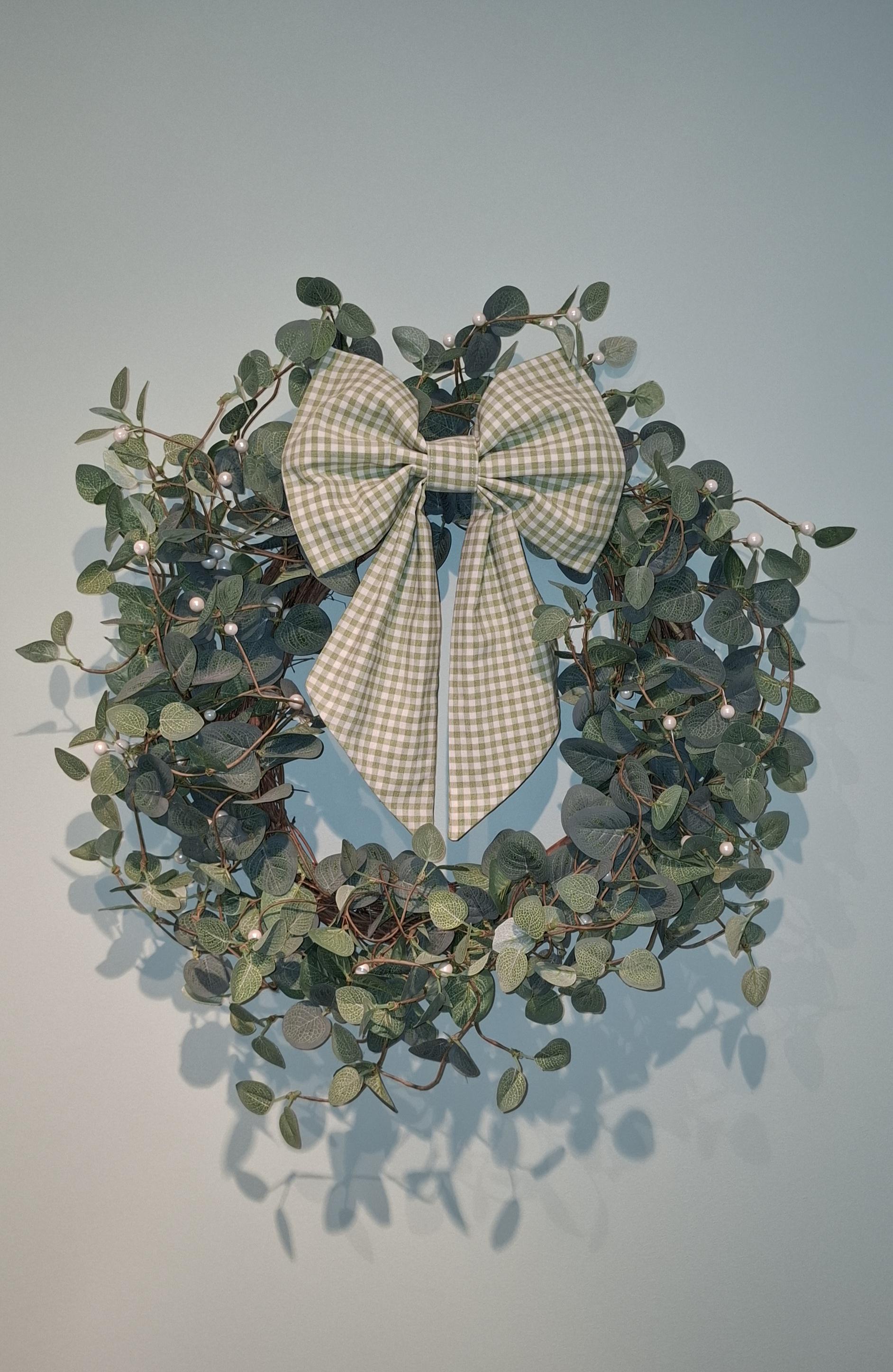 A Handmade fabric hanging bow made in Green and cream gingham.